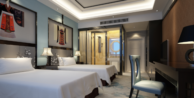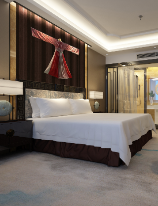 整个客房不仅充分利用了中式风的木质家具特点,墙上中国风的挂画、木质线条收边设计,都尽情展现了东方古韵与现代时尚的完美融合。客房内的一物一景,让人仿佛置身园林之中,在繁忙的都市里得到心灵的沉淀,享受当代东方的雅致生活。
